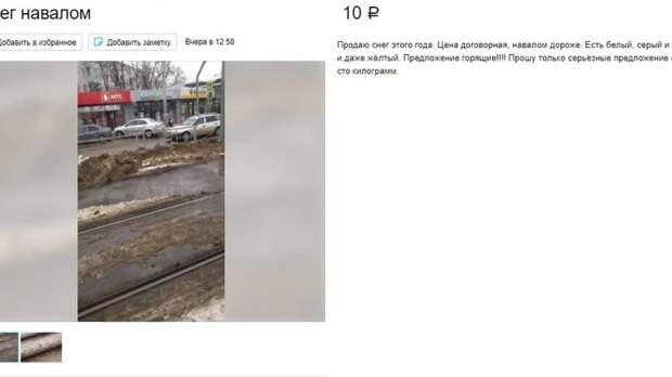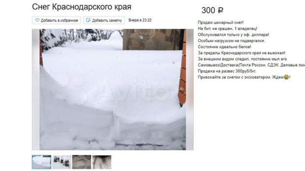 В Сети также начали появляться объявления о продаже снега. Авторы предлагают снег разных цветов: "есть белый, серый и даже желтый", а также "шикарный снег, состояние идеально белое, один владелец". Кто-то даже назначил цену – 300 рублей за 5 килограммов, а также предлагает доставку в другие города. Кроме того, есть услуга самовывоза – на экскаваторе.