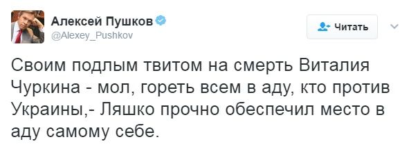 Российский сенатор Алексей Пушков прокомментировал кощунственный "твит" лидера украинской Радикальной партии Олега Ляшко о смерти постпреда РФ при ООН Виталия Чуркина.