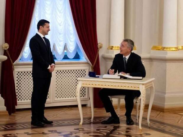 На фотографии видно, что украинский лидер сомкнул руки впереди себя, будто отчитываясь в провинности перед генсеком альянса.