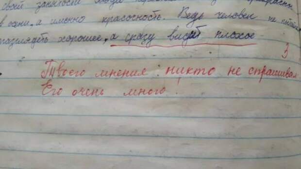 Его очень много!" За саму работу старшеклассник получил тройку.Инцидент вызвал общественный резонанс, поскольку сочинения как раз и пишут с целью выражения личного мнения.