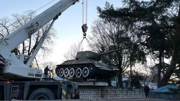 В украинском Мукачеве демонтировали памятник советскому танку. Решение убрать его с постамента приняли в местном городском совете.