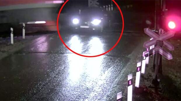 Камеры видеонаблюдения засняли жуткую аварию. Слышно, как поезд при приближении к переезду начинает сигналить, но остановиться локомотив не успел.