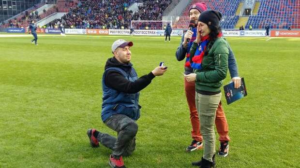 В перерыве матча между ЦСКА и "Ростовом" зрители на трибунах и у экранов телевизоров могли наблюдать трогательную картину - болельщик столичного клуба вышел на поле, чтобы сделать предложение руки и сердца своей девушке.