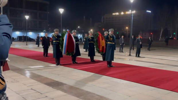 Президент РФ Владимир Путин и киргизский лидер Садыр Жапаров возложили венки к мемориалу Вечного огня на площади Победы в Бишкеке.