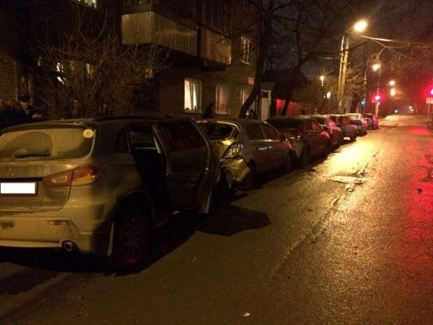 После этого оба автомобиля врезались в припаркованные у тротуара автомобили. Всего пострадали девять машин.