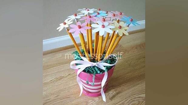 Это милый подарок, который мастерить не так сложно. Вырезаем из картона столько же ромашек, сколько у вас заготовлено карандашей. Дыроколом в каждом цветке делаем дырочку. В эти дырки будем вставлять стебли-карандаши.