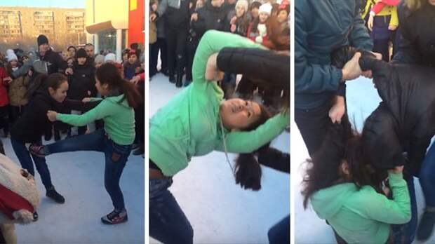 На кадрах записи видно, как девушки таскают друг друга за волосы и бьют кулаками. Когда конфликт грозил обернуться серьезными последствиями, в драку вмешались молодые люди и разняли подростков.