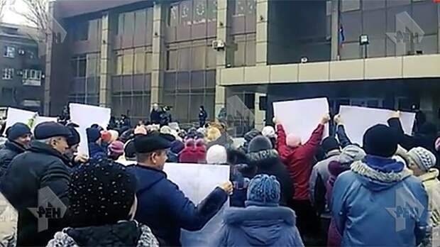На митинге присутствуют представители Федерации профсоюзов и сотрудники Енакиевского металлургического завода.