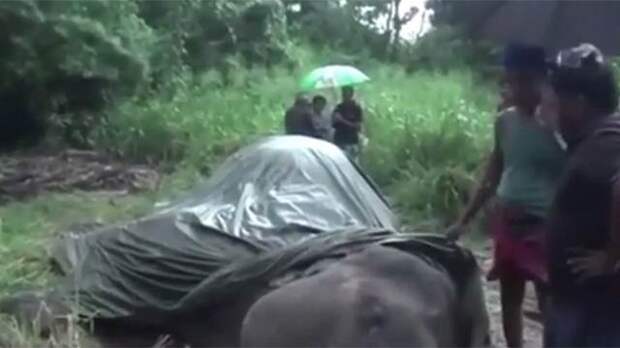 В Шри-Ланке местные жители запечатлели слона, который лежит на земле. Его под дождем накрывают местные жители из соседнего города Сигирии. По данным издания Dailymail, на кадрах запечатлен слон мужского пола по имени Канакота, ему было 18 лет.