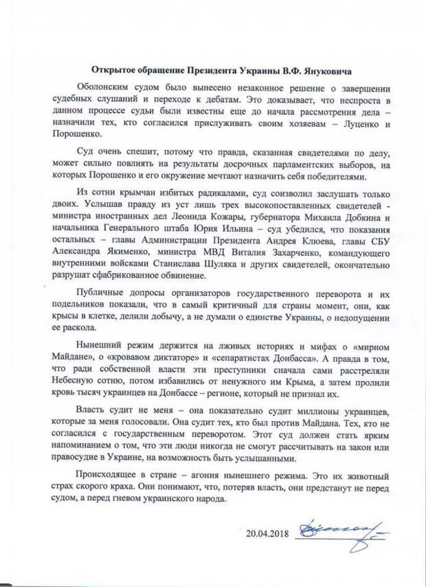 Оболонский суд Киева вынес незаконное решение о завершении судебных слушаний и переходе к дебатам в деле о госизмене Виктора Януковича. Об этом в открытом письме заявил сам бывший украинский лидер.