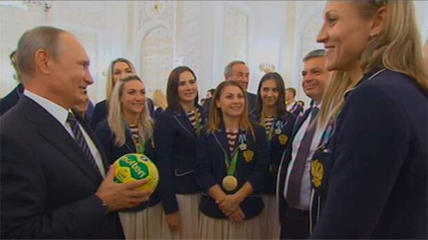 Олимпийские чемпионки по гандболу на встрече в Кремле подарили президенту России мяч.
