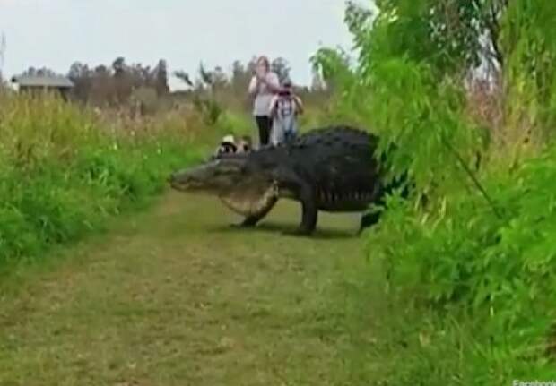 В Сети появился ролик с гигантским аллигатором. Его разместили смелые туристы, которые не испугались и не бросились бежать, завидев дикое животное. Они с любопытством разглядывали аллигатора и снимали его на видео.