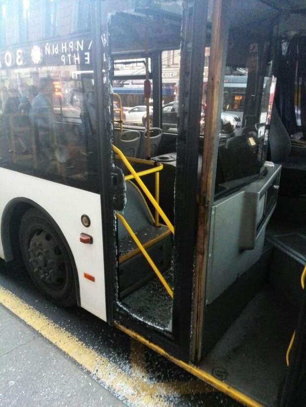Девушка разбила дверь автобуса в Петербурге. Об этом рассказали пользователи Сети и выложили фото.