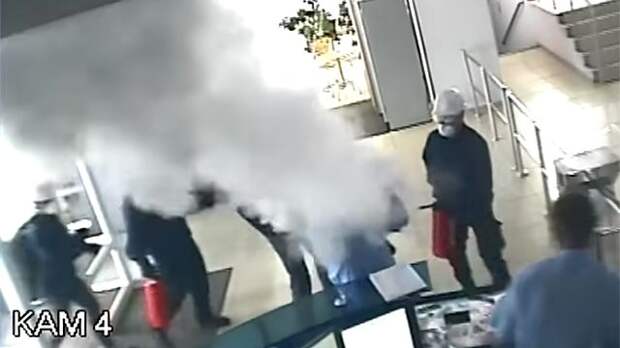 На кадрах 10 человек в медицинских масках, темных пиджаках с рюкзаками защитного цвета врываются в офис, нападают с огнетушителем на охранников и пробираются внутрь.