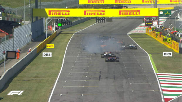 Гонку Гран-при Тосканы - этапа чемпионата мира по автогонкам в классе машин "Формула-1" - приостановили из-за аварии, участниками которой стали четверо гонщиков. Красный флаг был поднят для освобождения трассы от разбитых частей болидов. Об этом
