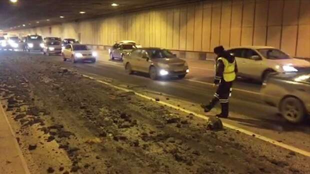 В Москве на Третьем транспортном кольце в районе Лефортовского тоннеля грузовик высыпал куски снятого асфальта, сообщает источник РЕН ТВ.