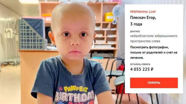 Спасение только в иммунотерапии, препарат "Динатуксимаб-бета" должен научить организм мальчика самостоятельно находить и уничтожать клетки опухоли. Но стоимость курса лечения вызывает слезы даже у обычно стойкого отца мальчика – 4 миллиона 55 тысяч 225 рублей.