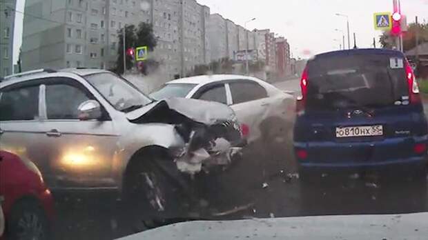 Камера видеорегистратора запечатлела момент аварии на одном из перекрестков Омска, в ходе которой вылетевшая на встречку "Лада Калина" протаранила несколько машин, стоящих на светофоре.
