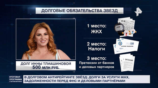 В долговом анти-рейтинге богатых и знаменитых самые разные счета, которые вовремя не были погашены. На первом месте – от служб ЖКХ. На втором – от налоговиков. На третьем – претензии от банков и деловых партнеров. Самая злостная неплательщица – блогер Инна Тлиашинова. На ней числится полмиллиарда рублей.