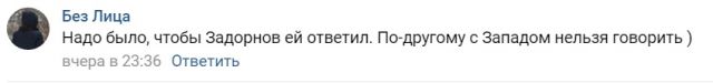 "Надо было, чтобы Задорнов (российский писатель-сатирик и юморист Михаил Задорнов – Прим. РЕН ТВ) ей ответил", – предлагает еще один комментатор.
