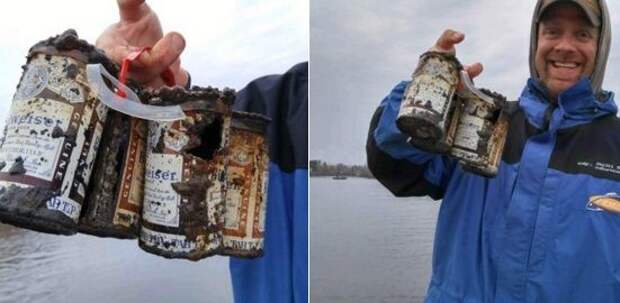 Необычный улов принесли с очередной рыбалки на реке Вульф в американской Висконсине трое друзей. Вместо привычной рыбы в этот раз один из мужчин подцепил на крючок упаковку с пивом 1950-х годов.