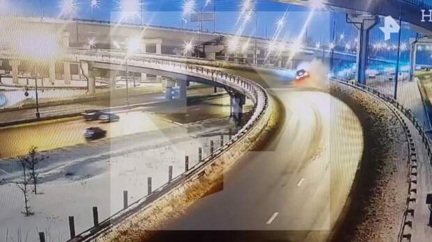 В распоряжении РЕН ТВ 8 февраля появились кадры падения с эстакады на МКАД иномарки Mercedes на автомобиль Hyundai с эстакады в Москве.