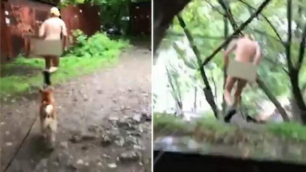 Он отчаянно пытался скрыться, из одежды на нем только кепка и ботинки. Кажется, вот-вот и собака цапнет нарушителя спокойствия за самое ценное, что у него есть.
