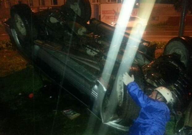По предварительным данным, автомобиль врезался в бетонный забор, после чего отлетел от него и перевернулся.