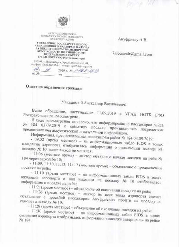 Как следует из ответа Ространснадзора, который получил спортсмен, что на табло отображался десятый выход, который не менялся. Также в ведомстве заявили, что диктор делал объявление о посадке, а за две минуты до ее окончания пассажиров Ануфриевых просили пройти к назначенному выходу.