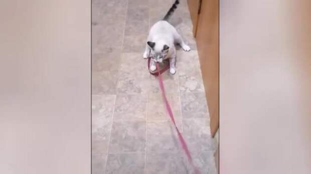 В кадре пушистая по кличке Буся не дает своей хвостатой подруге прогуляться, удерживая ее за поводок. Тем не менее собака Софи крупнее сожительницы и на призывы хозяйки подойти утаскивает кошку за собой.