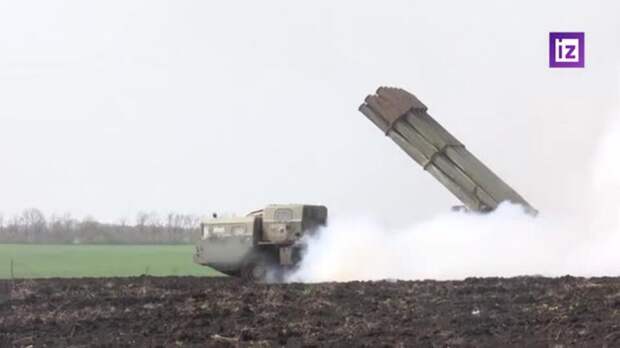 "Расчет реактивной установки залпового огня "Смерч", получив задачу на уничтожение складов с вооружением и боеприпасами, осуществил загрузку ракет и выдвижение на огневую позицию. Военнослужащие произвели точные расчеты положения цели и произвел залповый пуск", — подчеркнули в Минобороны.