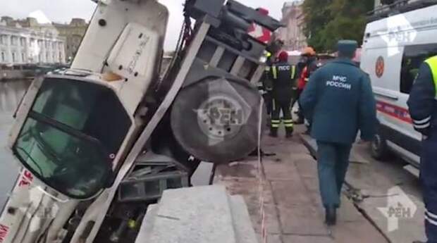 В самом центре Петербурга автокран упал в реку Фонтанка. Никто не пострадал.
