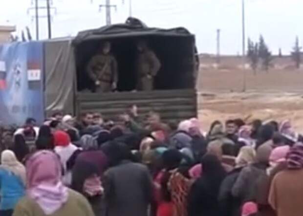 В центре временного размещения "Аль-Махалеш" выстроилась очередь за теплыми вещами. Жуткий холод, несвойственный для Сирии, заставил людей прийти сюда. Время от времени они отлучаются от грузовика, чтобы погреться у костра и размять заледеневшие ноги. В то время как российские сотрудники миссии примирения подыскивают им вещи, подходящие по размеру.
