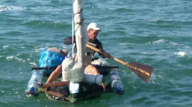 Предположительно, он был задержан сотрудниками пограничной службы. Мужчина находился на "судне", созданном из пластиковых бутылок и отдельных деревянных частей.