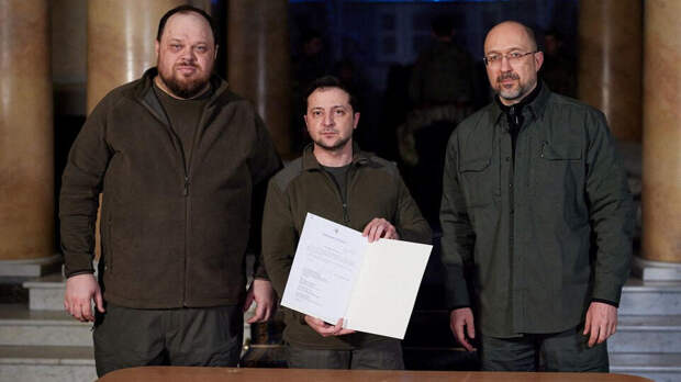 Президент Украины Владимир Зеленский позирует с премьер-министром Денисом Шмыгалем (справа) и спикером парламента Русланом Стефанчуком после подписания официального запроса о вступлении Украины в Европейский Союз. Ukrainian Presidential Press Service