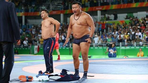 Тренер монгольского борца Мандахнарана Ганзоригийна в знак несогласия с судейским решением в матче за бронзу ОИ в Рио разделся до нижнего белья.