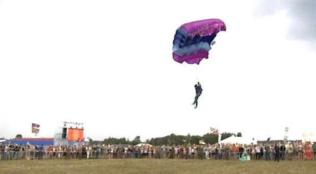 Парашютисты высадились перед многотысячной аудитории, проделав невероятные маневры в воздушном пространстве.