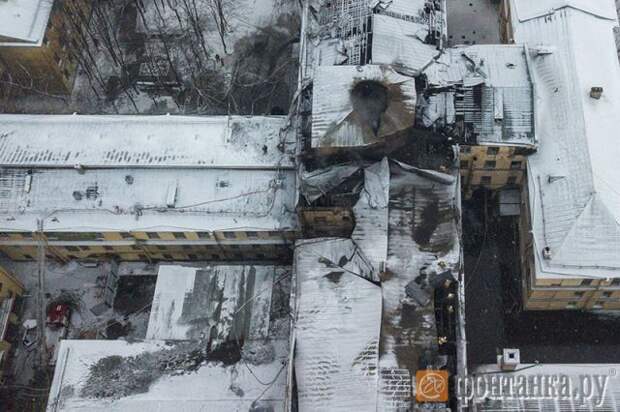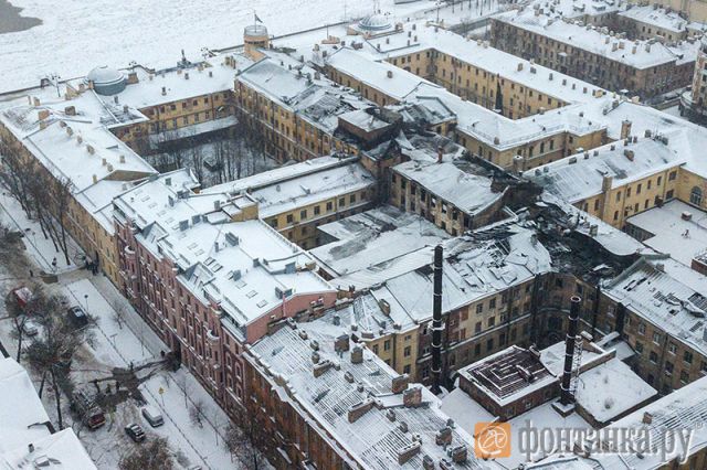 "Фонтанка" опубликовала снимки сгоревшего здания на набережной Лейтенанта Шмидта, сделанные с воздуха.