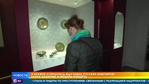 А это не только хохлома и шкатулки, но и чарки, ковши, иконы. Всего около 400 работ в двух залах Московского Кремля: Успенской звоннице и Патриаршего дворца. Всё работы русских ювелирных фирм и мастеров, которые два года подряд собирали по частным коллекциям всего мира. Например, шитое жемчугом изделие фабрики Фаберже.