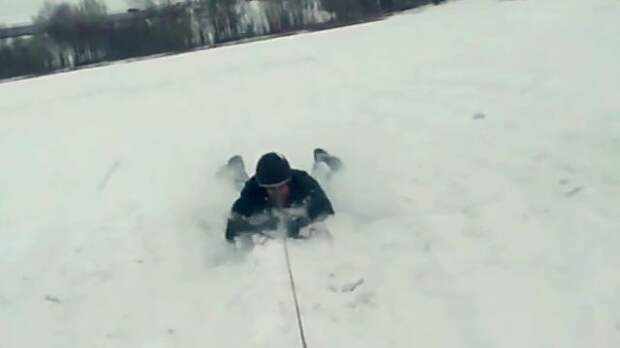 На кадрах ролика видно, как один из любителей пощекотать себе нервы лежит на животе на салазках. Непонятное транспортное средство, к которому тросом привязаны санки, начинает набирать скорость.