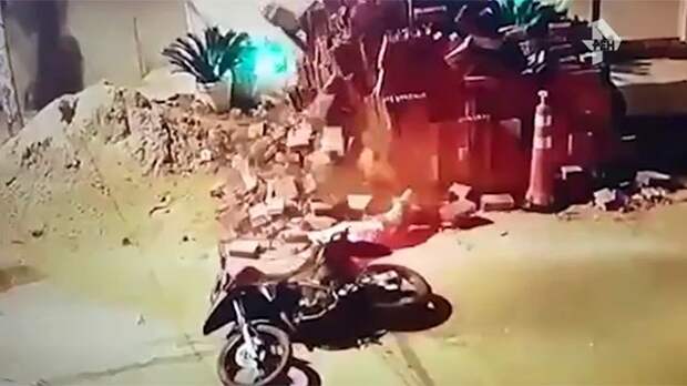 Взгляните, байкер на огромной скорости врезается в груду кирпичей. Услышав грохот и стоны, на место уже спешат хозяева фазенды.