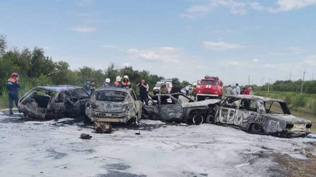 Предварительно установлено, что ДТП произошло примерно в 12:10 (11:10 мск) на 367-м километре дороги Самара - Пугачев - Энгельс - Волгоград. В аварию попали иномарка Opel, а также три отечественных автомобиля ВАЗ. После столкновения машины загорелись.