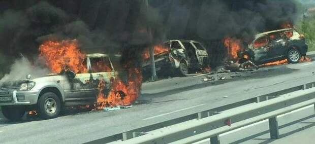 После столкновения загорелся один автомобиль, а затем пламя перекинулось на другие машины.