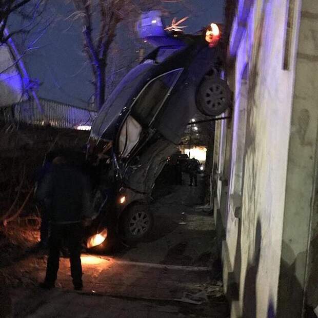По словам очевидцев, автомобиль вылетел с дороги и буквально рухнул на дом. Отмечается, что машина в полете задела столб.