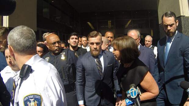 На этом Конор не остановился и попытался бросить в сторону автобуса другие попадавшиеся под руку предметы — металлические ограждения и мусорный бак. Этот беспредел остановила охрана комплекса.
