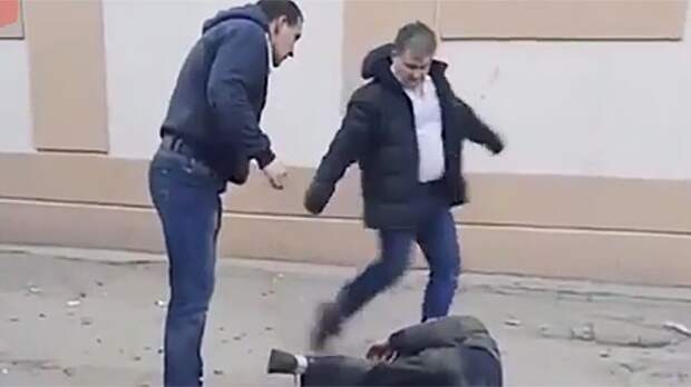 В конце ролика мужчина лежит на асфальте, не в силах встать на ноги. За него вступаются очевидцы, которые заставляют мужчин прекратить избивать его.