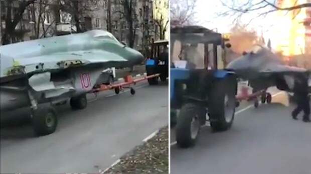 На опубликованном видео видно, как огромный самолет тащит обычный трактор. Задача перед его водителем стоит непростая - дорога слишком узкая для такого воздушного судна. Кроме того, по бокам припаркованы машины. Миг-29 проходит буквально в сантиметрах от легковушек.