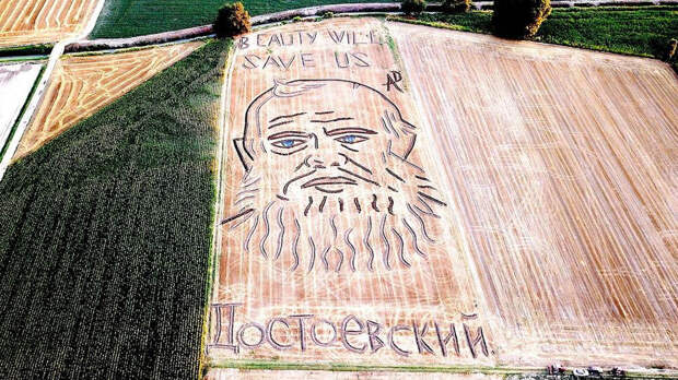 На поле в Италии появился 200-метровый портрет Федора Достоевского, выполненный мастером работ в жанре "ленд-арт" Дарио Гамбарином. Художник посвятил его 200-летнему юбилею русского писателя. В беседе с РИА Новости он отметил, что для создания произведений использует лишь трактор и плуг.