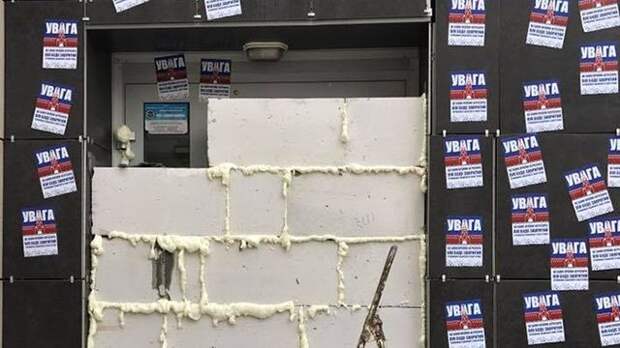 На фото с места акции видно, что радикалы заклеили фасад здания листовками, закрасили его краской, а вход в помещение забаррикадировали строительными блоками.