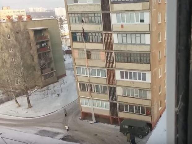 В Орле очевидец заснял на видео, как мужчина попытался покинуть квартиру через окно по веревке из простыней, но упал.
